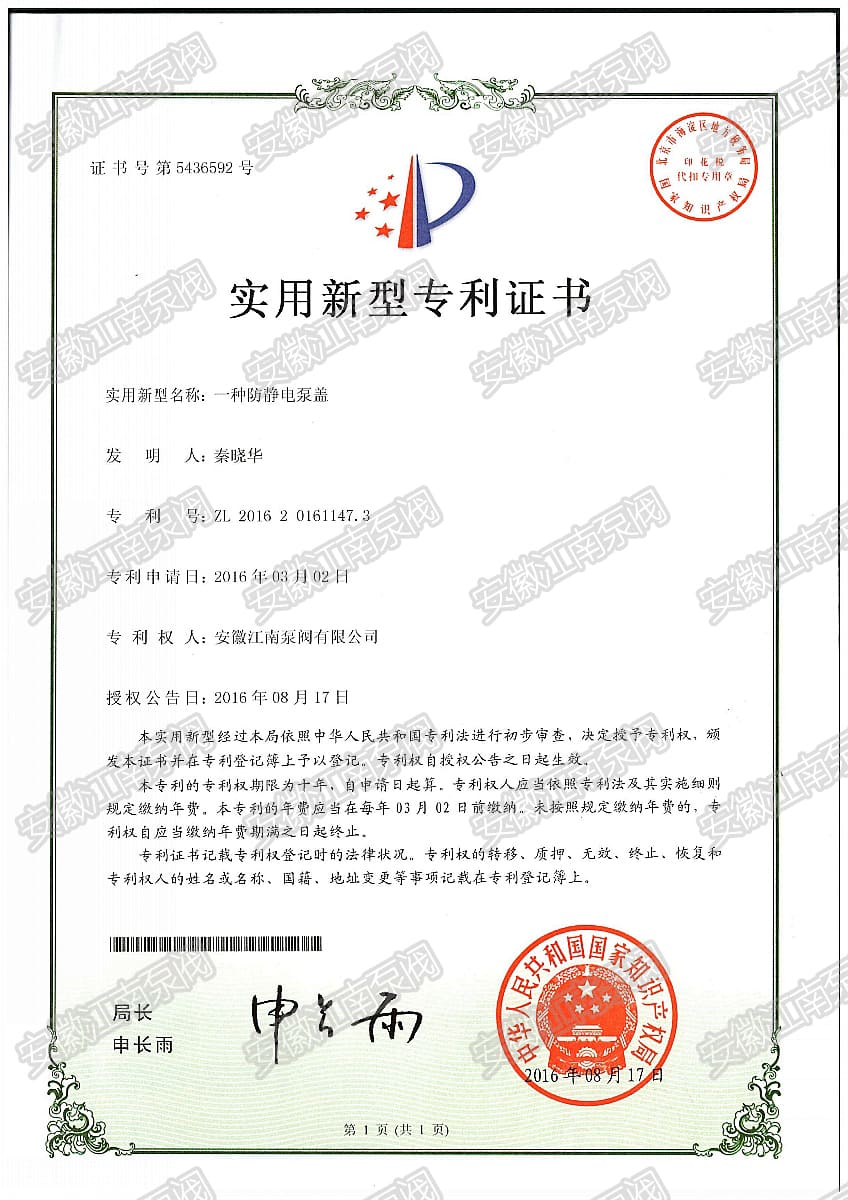 安徽江南泵閥有限公司榮獲防靜電耐腐蝕化工泵泵蓋專利,主營:氟塑料泵,不銹鋼泵,耐腐蝕化工泵,品質卓越,行業領跑企業,科研生產型企業20年鑄就行業輝煌!...