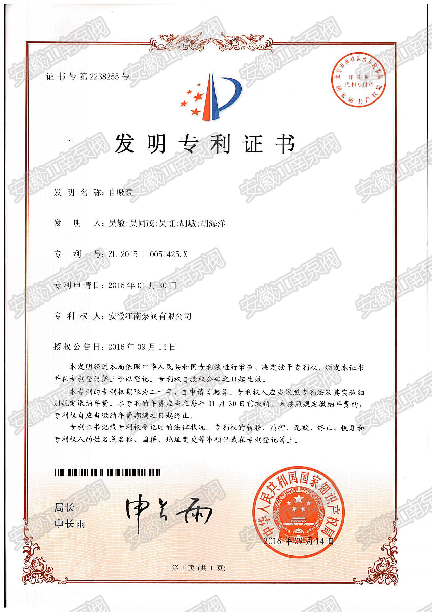 耐腐蝕自吸泵發明專利證書  Hot!
